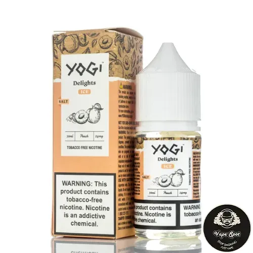 Shop the Yogi Delights Salts Peach Ice 30ml In Dubai, featuring a blend of juicy peaches with a blast of refreshing menthol and synthetic nicotine salts.